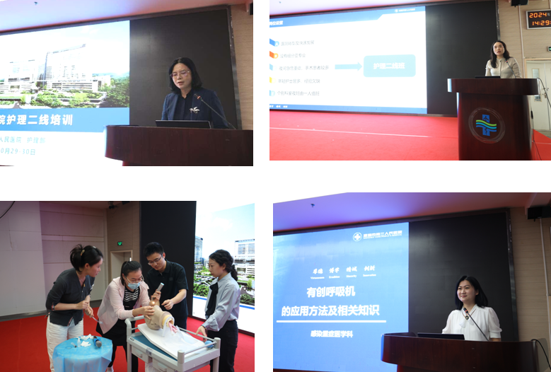 本年度护理二线培训在形式和组织上进行改进,分为综合及专科部分,邀请相关领域经验丰富的护理老师进行授课。综合部分首先由护理部刘桂清对全院护理二线查房情况进行汇总分析,针对护理二线人员工作中遇到的特殊情况,提出改进措施,提升护理二线查房的质量。接下来培训围绕护理二线质控管理、急重症抢救程序、脑卒中及心血管急症护理技巧、老年、儿童、孕产妇等人群特点及急救知识、气管插管医护配合、各类呼吸机使用等核心内容展开,理论讲解与实操演练相结合的方式,确保每位培训人员都能掌握关键技能。