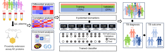 在这项研究中,团队收集了222份血浆样本,分别来自健康对照组(HCs)、疾病对照组(非结核性肺炎; PN)、结核病患者(TB)以及治愈后的结核病病例(RxTB)。他们运用高通量蛋白质检测技术——多重邻近延伸试验(PEA),测量了92种免疫蛋白的水平。经过详细的鉴别分析和与结核病严重程度的相关性研究,研究团队最终选定了9个生物标志物(CXCL9、PDL1、CDCP1、CCL28、CCL23、CCL19、MMP1、IFNγ和TRANCE)。随后,他们利用7种不同的机器学习方法探索了这些生物标志物的诊断能力。研究结果显示,这9种生物标志物的组合能够准确地区分结核病病例和对照组,受试者工作特征曲线下面积(AUROC)高达0.89至0.99,敏感性达到82%-93%,特异性达到88%-92%。而且,该模型在区分结核病严重程度方面表现卓越,AUROC超过0.95,敏感性和特异性均超过93.3%。这些特征在结核病的早期精确诊断和临床结果预测方面具有巨大潜力。