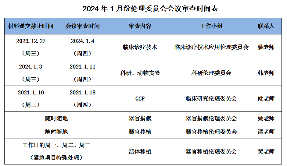 2024年1月份伦理委员会会议审查时间表