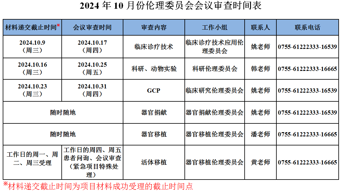 伦理委员会2024年10月份会议审查时间安排如下,如有临时调整,将另行通知。为保证研究的顺利进行,请有伦理审查需求的研究者尽早提交申请,以免耽误研究进程。
