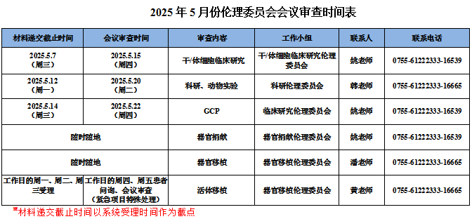 伦理委员会2025年5月会议审查时间安排如下,如有临时调整,将另行通知。