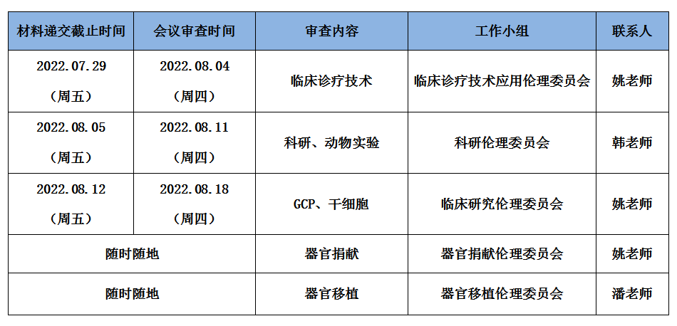 2022年8月份伦理委员会会议审查时间表