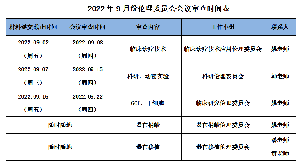 2022年9月份伦理委员会会议审查时间表