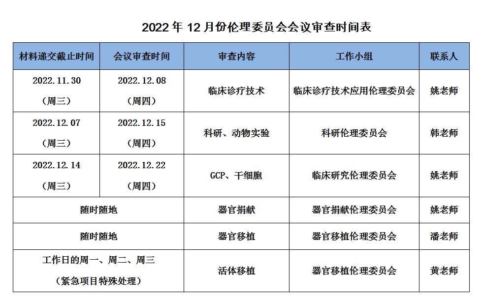 2022年12月份伦理委员会会议审查时间表