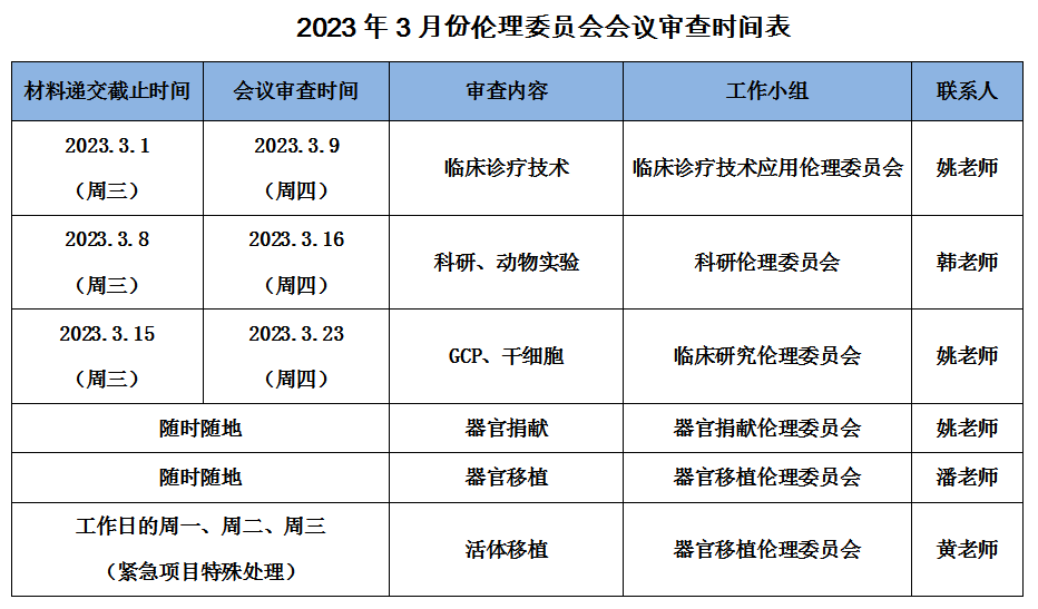 2023年3月份伦理委员会会议审查时间表