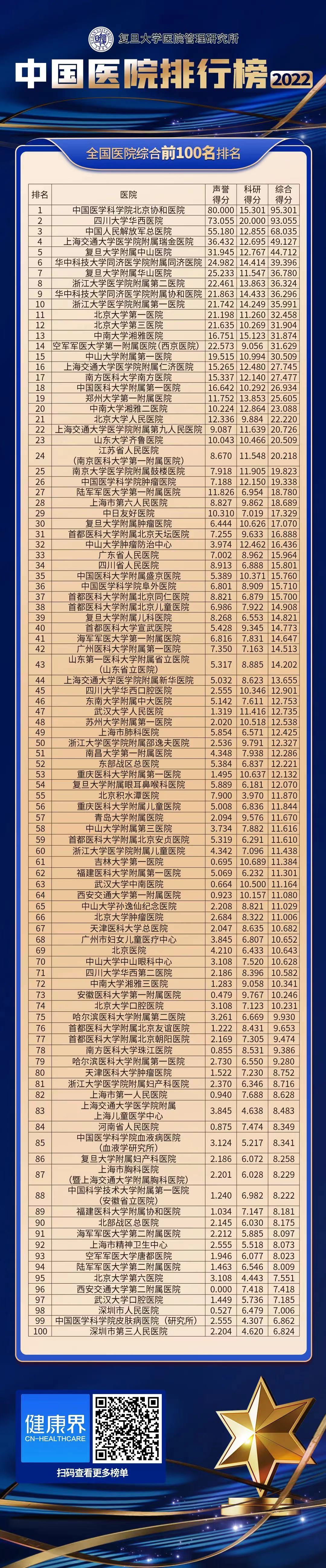 稿件来源:海角社区 发布时间:2023-11-25 15:05:5311月25日,复旦大学医院管理研究所发布《2022年度中国医院排行榜》,海角社区 (南方科技大学第二附属医院)排行第100位。这也是继两年前进入《2020年度中国医院排行榜》后,深圳市三医院第二次进入复旦版中国百强医院。