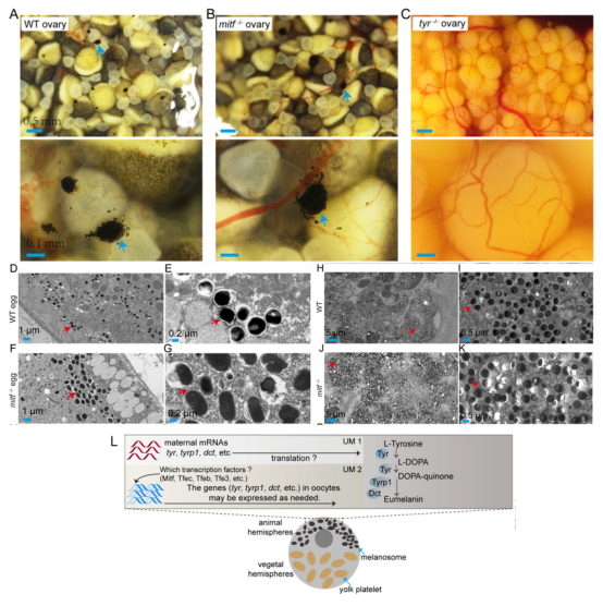 黑色素合成在黑色素瘤的发生、转移及侵袭过程中发挥着重要作用。黑色素的合成起始于酪氨酸,在酪氨酸酶的作用下酪氨酸逐步氧化为左旋多巴,随后经过一系列复杂反应最终形成黑色素。针对黑色素合成途径的治疗策略已经成为黑色素瘤治疗的研究热点,如酪氨酸酶是目前黑色素瘤治疗的一个重要靶点。卵母细胞中的黑色素沉积是热带爪蛙卵母细胞发育的关键特征,影响卵母细胞的极性建立。目前的研究主要集中于对黑素细胞和视网膜色素上皮细胞中,但缺乏对卵母细胞黑色素生成的分子机制探索。本研究以热带爪蛙卵母细胞为研究对象,探索黑色素合成关键基因tyr及黑色素细胞谱系发育关键基因mitf基因敲除后黑色素细胞的发育过程。结果显示热带爪蛙卵母细胞中的色素沉积并不依赖于黑色素细胞主要调节因子Mitf。在mitf基因敲除的爪蛙中,黑色素生成关键基因的表达显著降低,这表明Mitf活性丧失。然而,mitf基因敲除的卵母细胞仍表达tyr mRNA,这使得黑色素能够在动物极生成并沉积。相比之下,tyr基因敲除的卵母细胞没有黑色素沉积,证实了Tyr的关键作用。因此,研究人员推测热带爪蛙卵母细胞的黑色素生成独立于Mitf,很可能在卵子发生过程中由Tfe3调控Tyr、Dct和Tyrp1的表达来实现。相关研究结果将为进一步阐明动物极色素沉着依赖Tyr但不依赖Mitf的机制研究奠定基础,有助于推动对黑色素生成和卵母细胞发育的深入理解。
