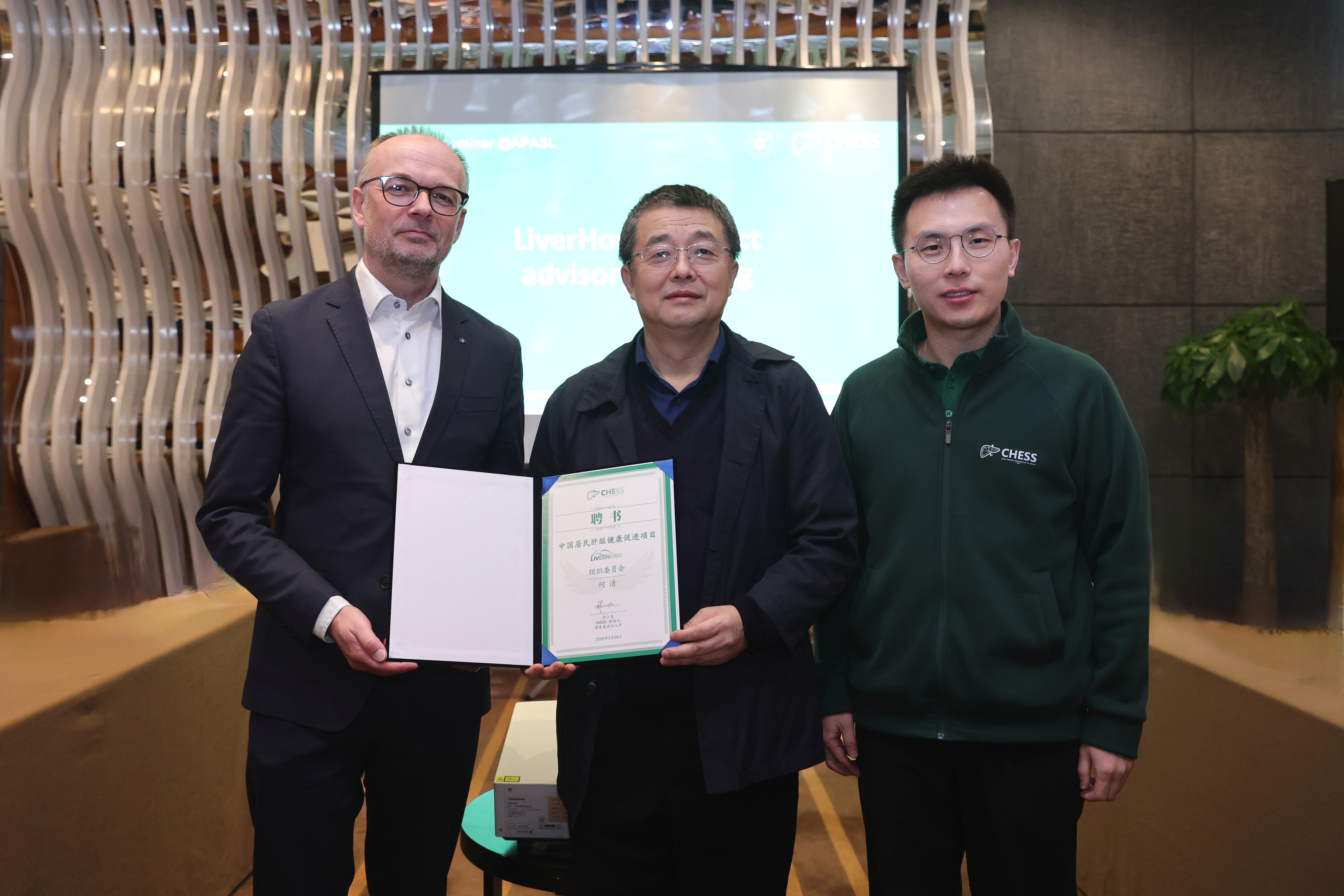 东南大学附属中大医院院长助理、全国门静脉高压联盟(CHESS)创始人祁小龙与欧洲肝病学会秘书长Krag还在现场为何清颁发了中国居民肝脏健康促进项目组织委员会聘书,对我院在相关领域取得的成绩予以高度的赞赏。