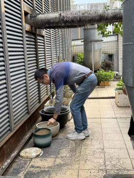 对天台上可能积水的花盆逐一翻转倒置,彻底消除积水隐患