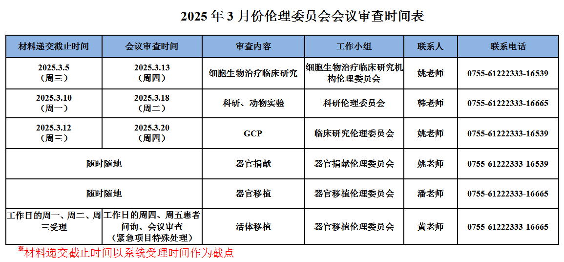 伦理委员会2025年3月会议审查时间安排如下,如有临时调整,将另行通知。
